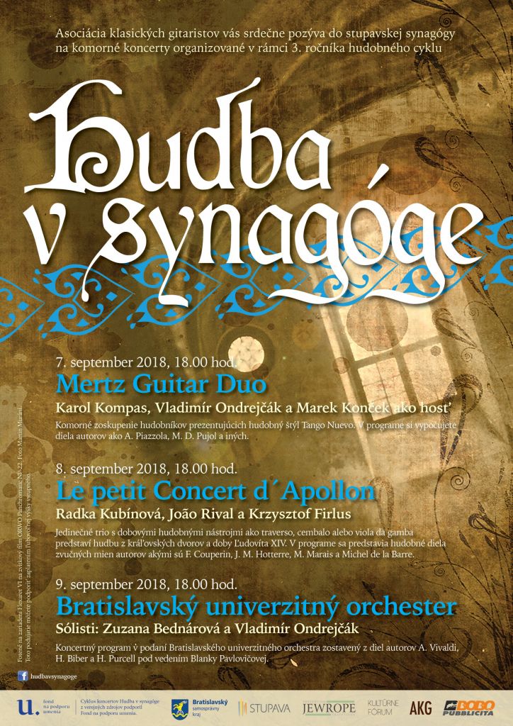 Asociácia klasických gitaristov vás srdečne pozýva do stupavskej synagógy na komorné koncerty organizované v rámci 3. ročníka hudobného cyklu HUDBA V SYNAGÓGE. V troch septembrových termínoch si v synagóge vypočujete Mertz Guitar Duo – komorné zoskupenie hudobníkov prezentujúcich hudobný štýl Tango Nuevo. Le petit Concert d´Apollon – jedinečné trio s dobovými hudobnými nástrojmi ako traverso, cembalo alebo viola da gamba – toto trio predstaví hudbu z kráľovských dvorov a doby Ľudovíta XIV. A posledný koncert odohrá Bratislavský univerzitný orchester, ktorého program bude zostavený z diel A. Vivaldiho, H. Bibera a H. Purcella. Srdečne vás pozývame a tešíme sa na vás.