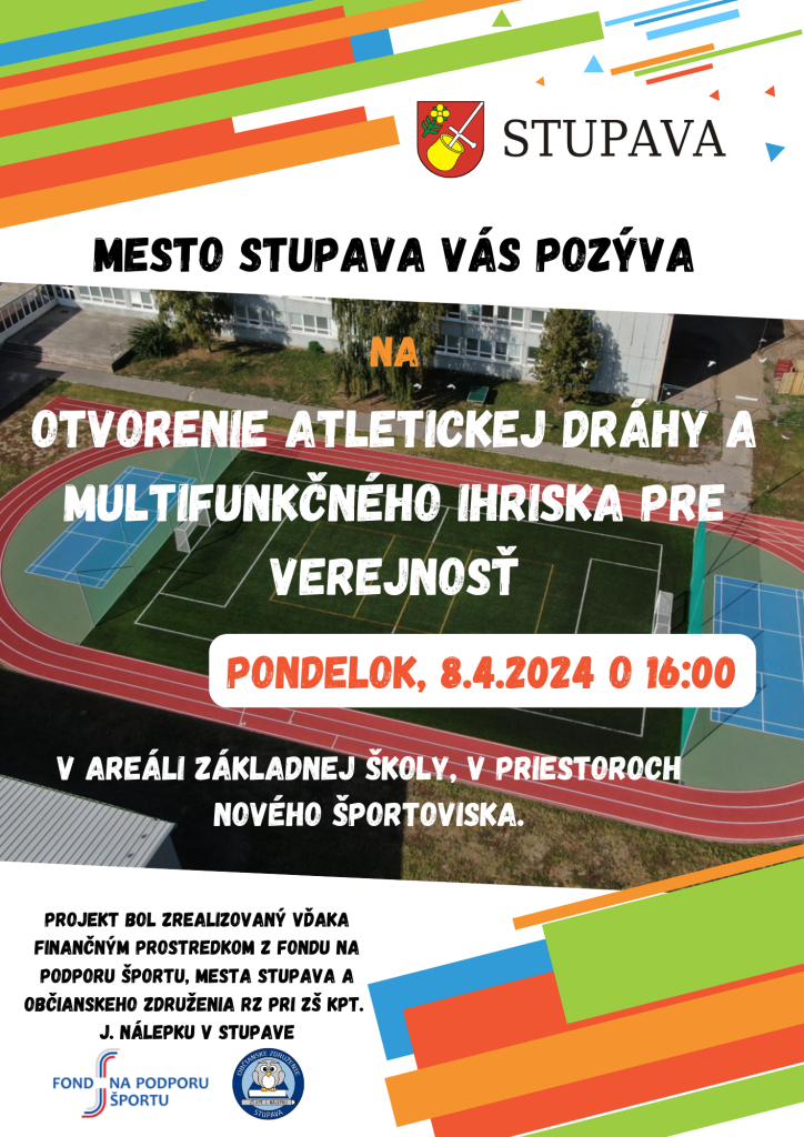 Srdečne Vás pozývame aj na oficiálne otvorenie atletickej dráhy a multifunkčného ihriska pre verejnosť, ktoré sa z technických a organizačných dôvodov uskutoční v pondelok 8. apríla 2024 o 16:00. Príďte si zašportovať a povzbudiť šikovné deti!