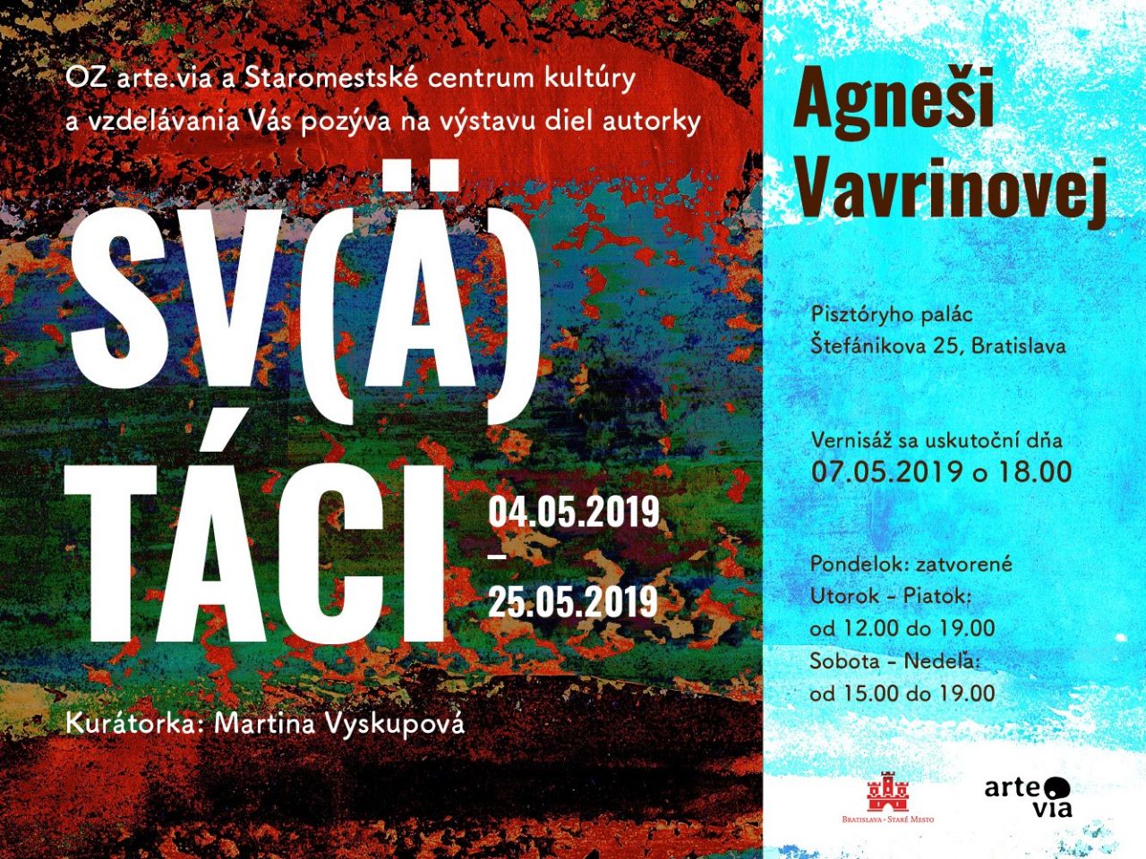 OZ arte.via a Staromestské centrum kultúry a vzdelávania vás pozývajú na vernisáž výstavy Sv(ä)táci autorky Agneši Vavrinovej, ktorá sa uskutoční dňa 7. mája 2019 o 18.00 hod. v Pistoriho paláci v Bratislave.