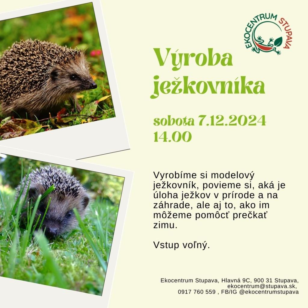 Pozývame vás v sobotu 7. decembra o 14.00 k nám na workshop, počas ktorého si vyrobíme modelový ježkovník. Povieme si aj to, prečo je ježko v prírode a na záhrade užitočný, čím sa živí a ako mu môžeme pomôcť prezimovať. Vstup je voľný.