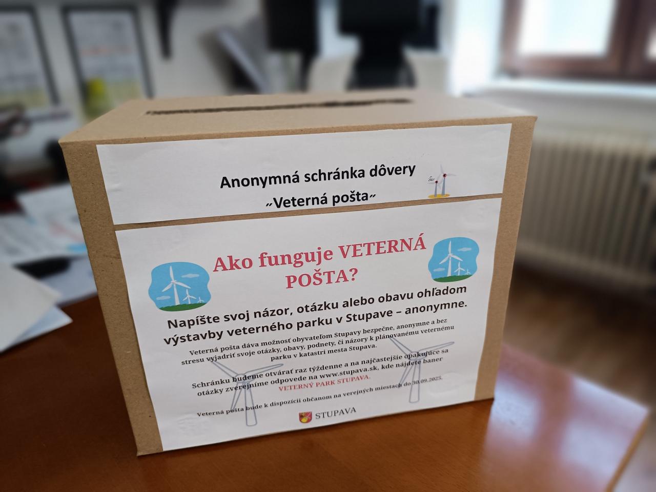 Mesto Stupava spustilo informačnú iniciatívu Veterná pošta, prostredníctvom ktorej sa môžete anonymne podeliť o svoje názory, obavy či otázky k zámeru výstavby veterného parku v katastri mesta Stupava. Schránky, do ktorých možno vhodiť svoje podnety, sú umiestnené na viacerých miestach v meste do konca septembra.