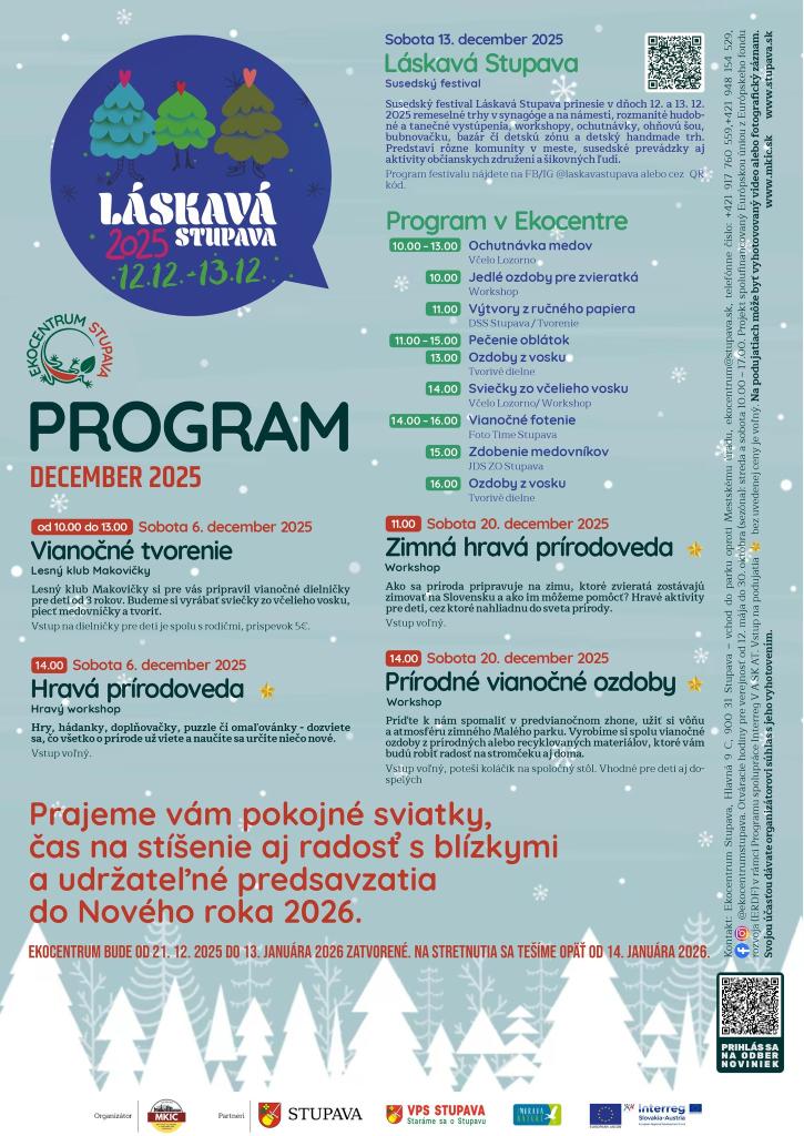 Sobota 13.decembra patrí aj u nás susedskému festivalu Láskavá Stupava. Ten prinesie v dňoch 12. a 13. 12.2025 remeselné trhy v synagóge a na námestí, rozmanité hudobné a tanečné vystúpenia, workshopy, ochutnávky, ohňovú šou, bubnovačku, bazár či detskú zónu a detský handmade trh.